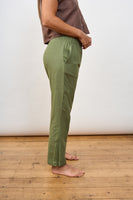 מכנסיים בגזרת בננה עם גומי מלפנים וכיסים בצדדים.