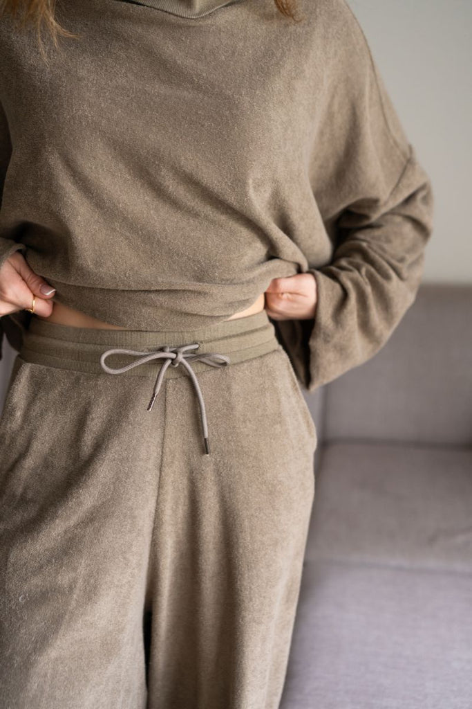 מכנסיים בגזרה מתרחבת, גומי ושרוך קשירה במותן וכיסים בצדדים.