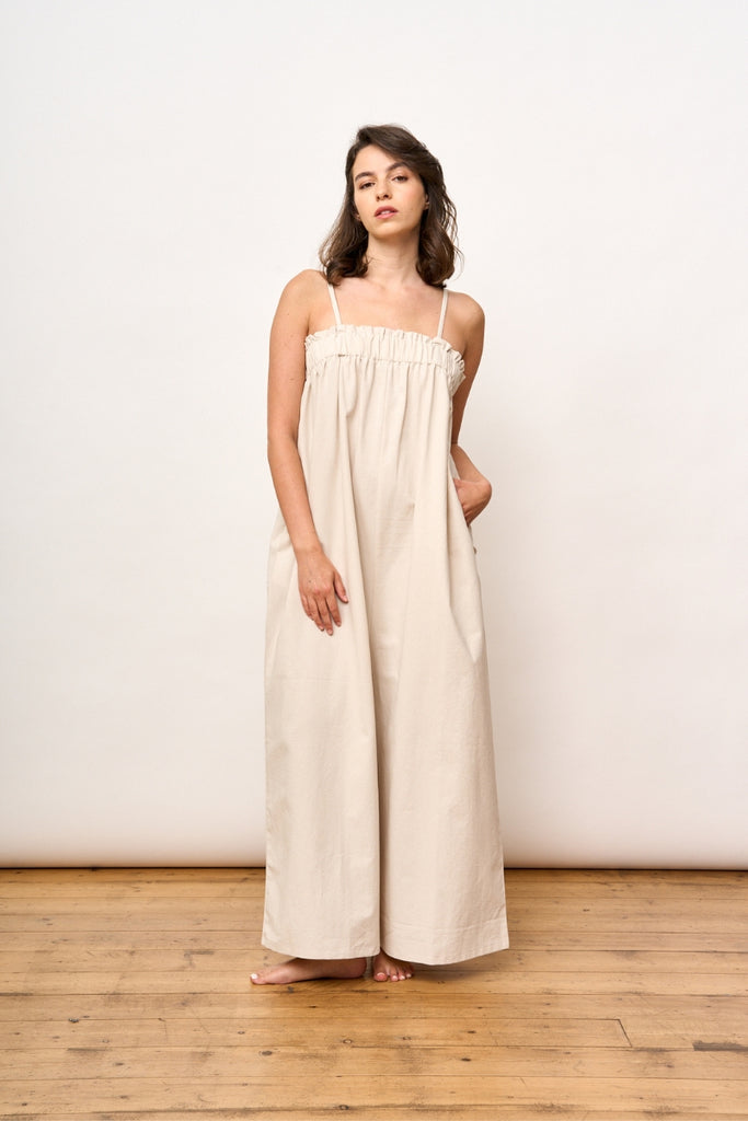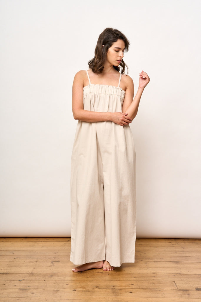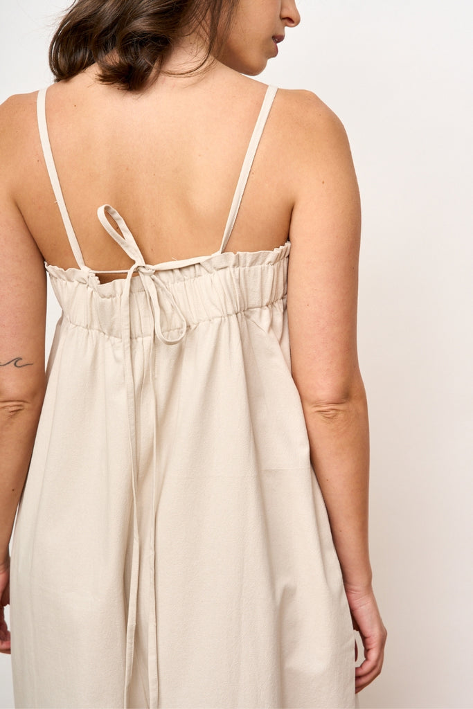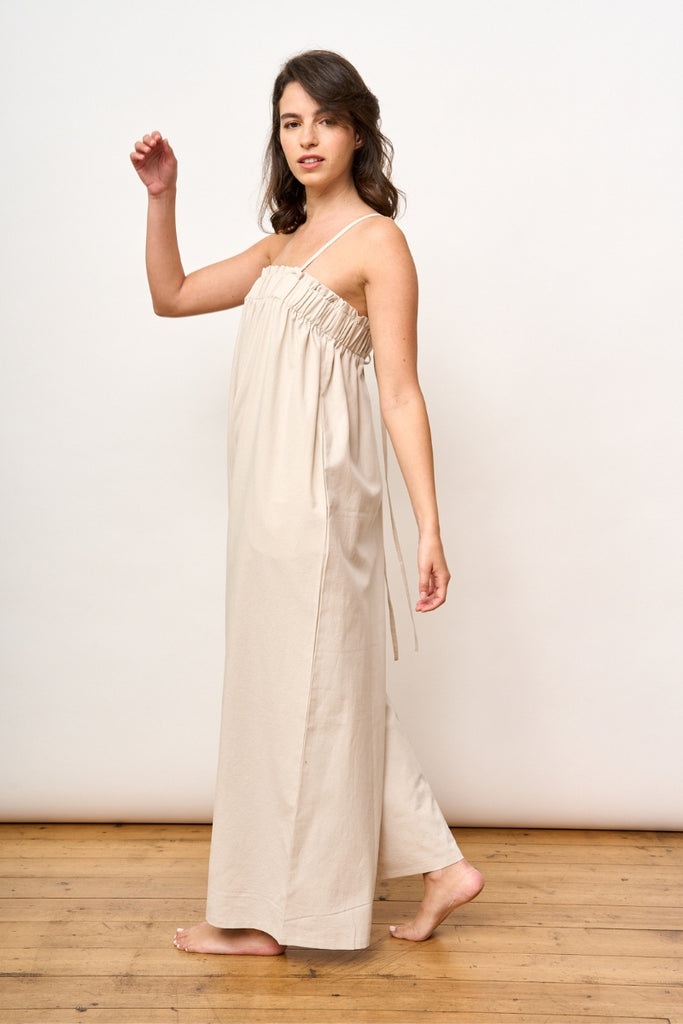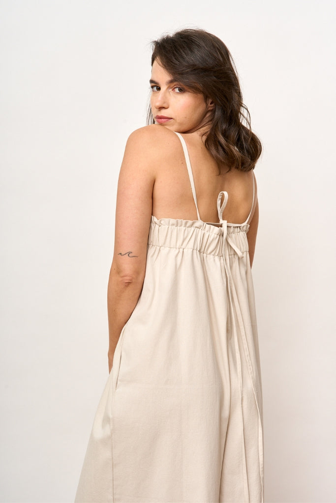 אוברול בגזרת אוברסייז עם כתפיות ספגטי הנקשרות בגב וכיסים בצדדים.