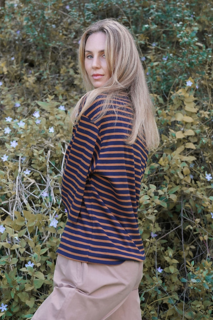 החולצה עשויה מבד 100% כותנה ומגיעה בצבעים: פסים שחור לבן, פסים כחול חמרה, פסים לבן חמרה.