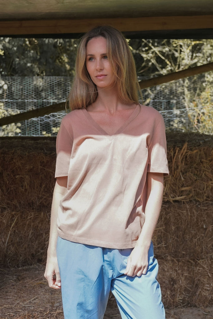 החולצה עשויה מבד כותנה 100% ומגיעה בצבעים: חום קפה, חמרה