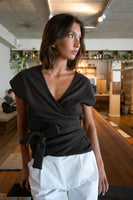 על המוצר חולצת מעטפת הניתנת לקשירה מלפנים או מאחור.
