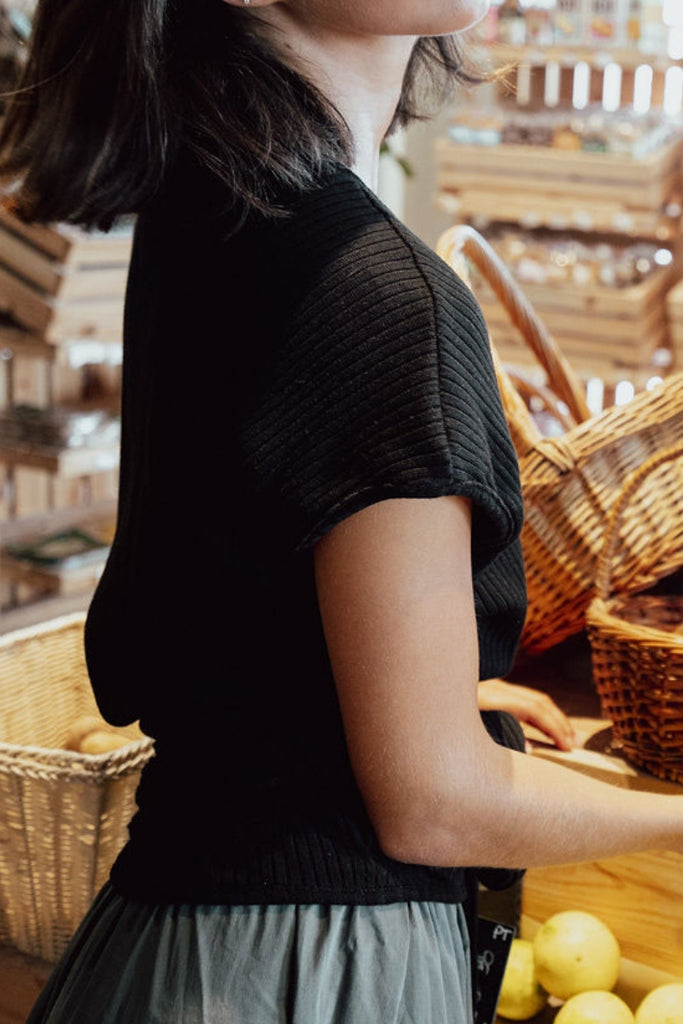 החולצה עשויה מבד סריג ריב בהרכב 100% כותנה. קיימת בצבעים: לבן, שחור וחום שוקולד.