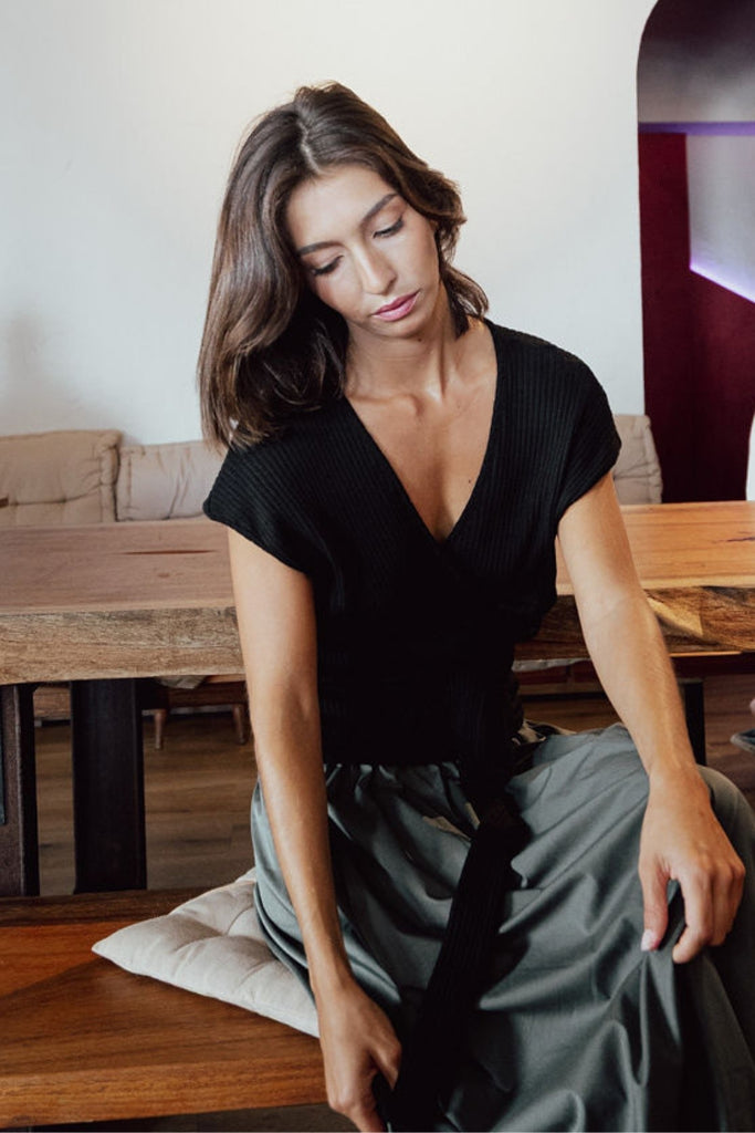 על המוצר חולצת מעטפת הניתנת לקשירה מלפנים או מאחור.מחמיאה לגוף, נעימה בטירוף, מושלמת גם ליום יום וגם לערב :)
