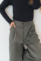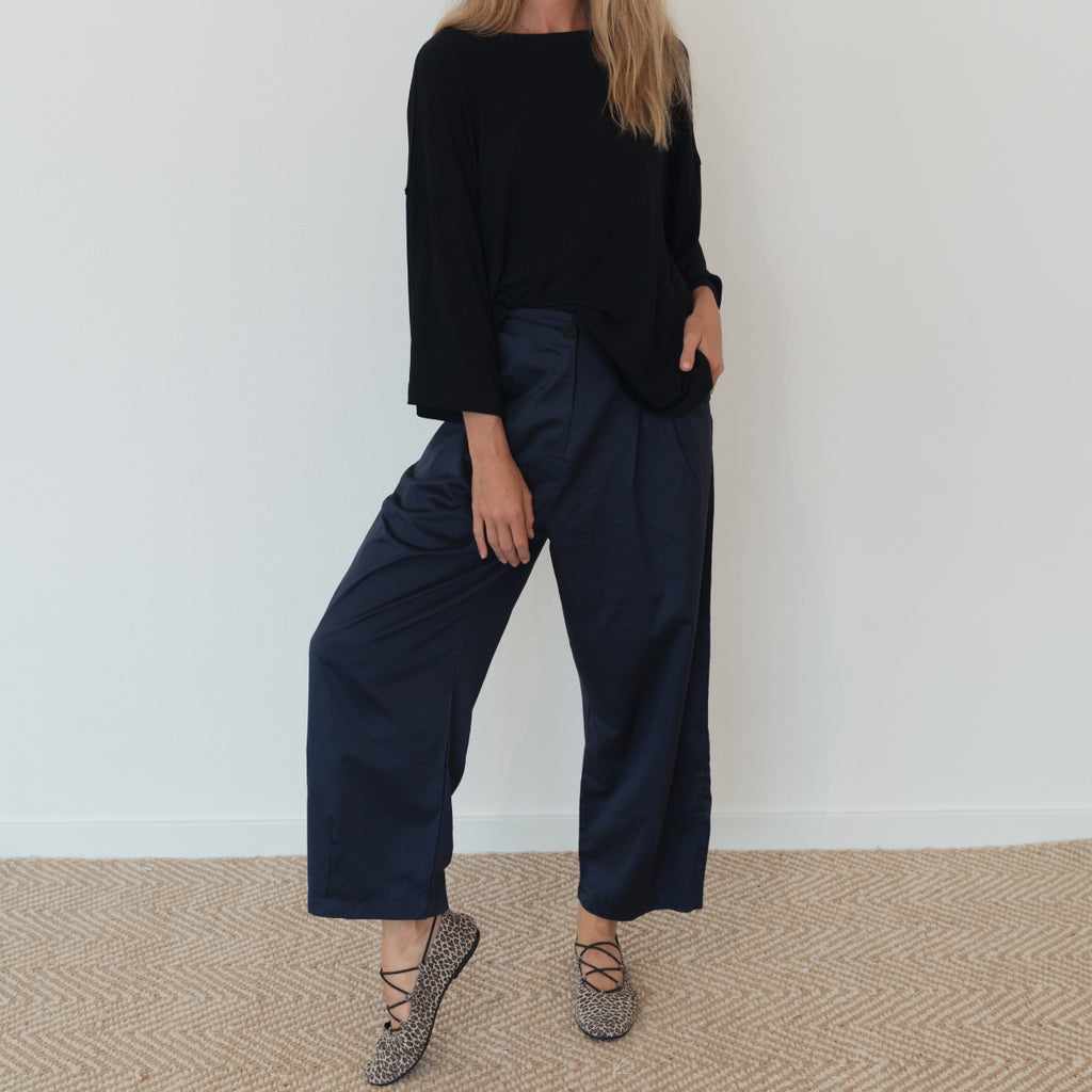 מכנסיים בגזרת בלון עם פנסים מקדימה, כיסים בצדדים וגומי בגב.