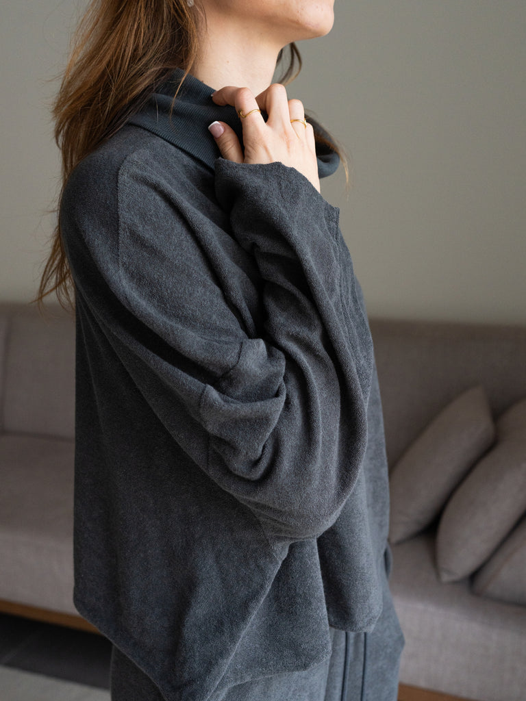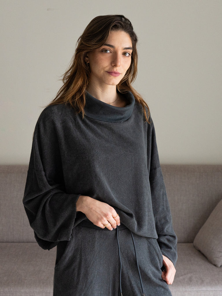 החולצה עשויה מבד פרנצ טרי100% כותנה ומגיעה בצבעים: אפור כהה וירוק חאקי.