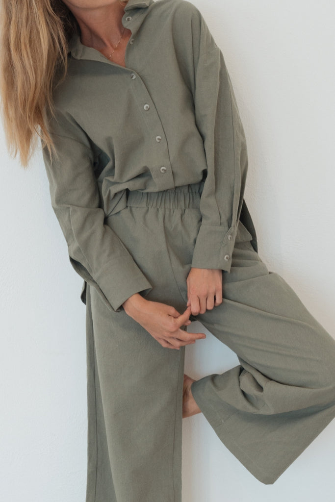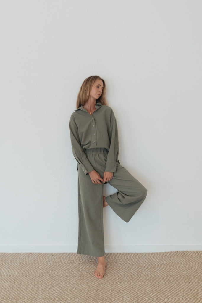 מכנסים בגזרה מתרחבת עם גומי בחלק העליון וכיסים בצדדים.