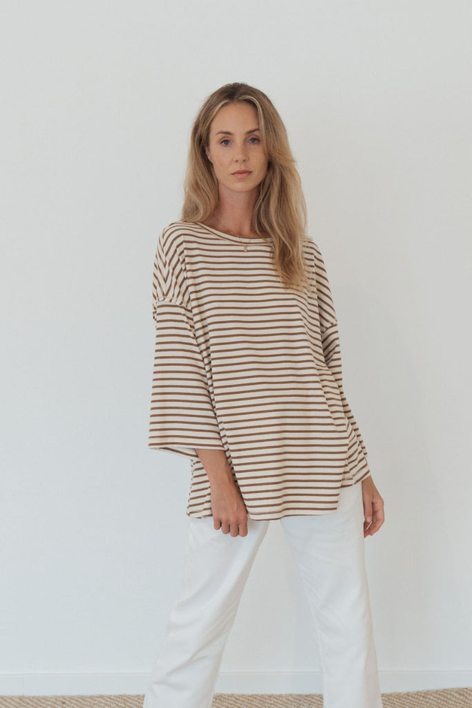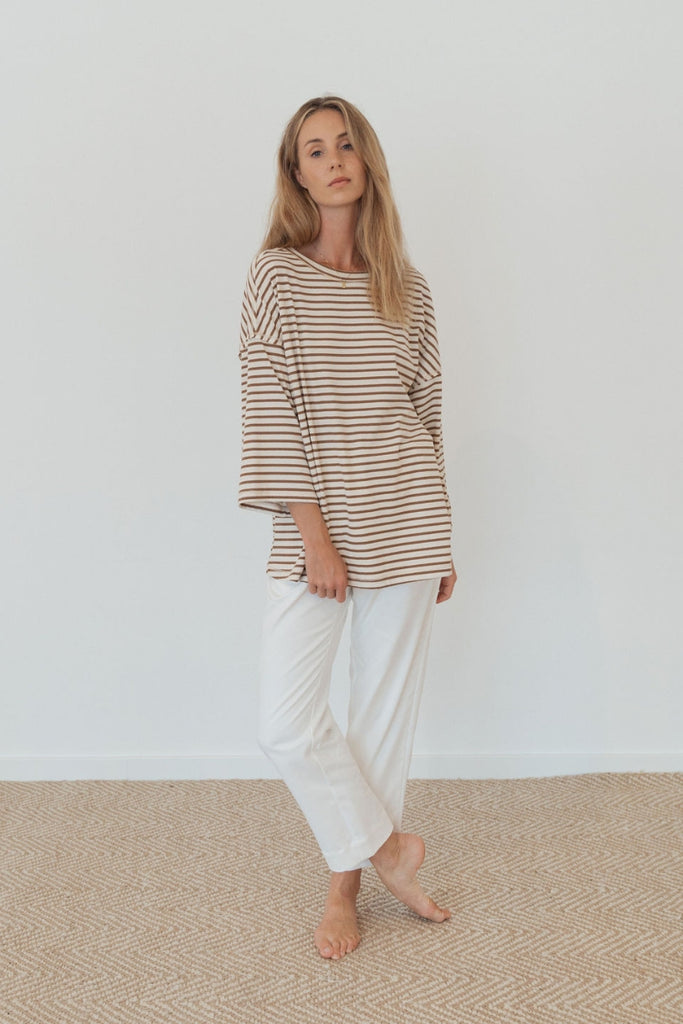 החולצה עשויה מבד סריג 100% כותנה. קיימת בצבעים: פסים חום שמנת, שחור ואבן.